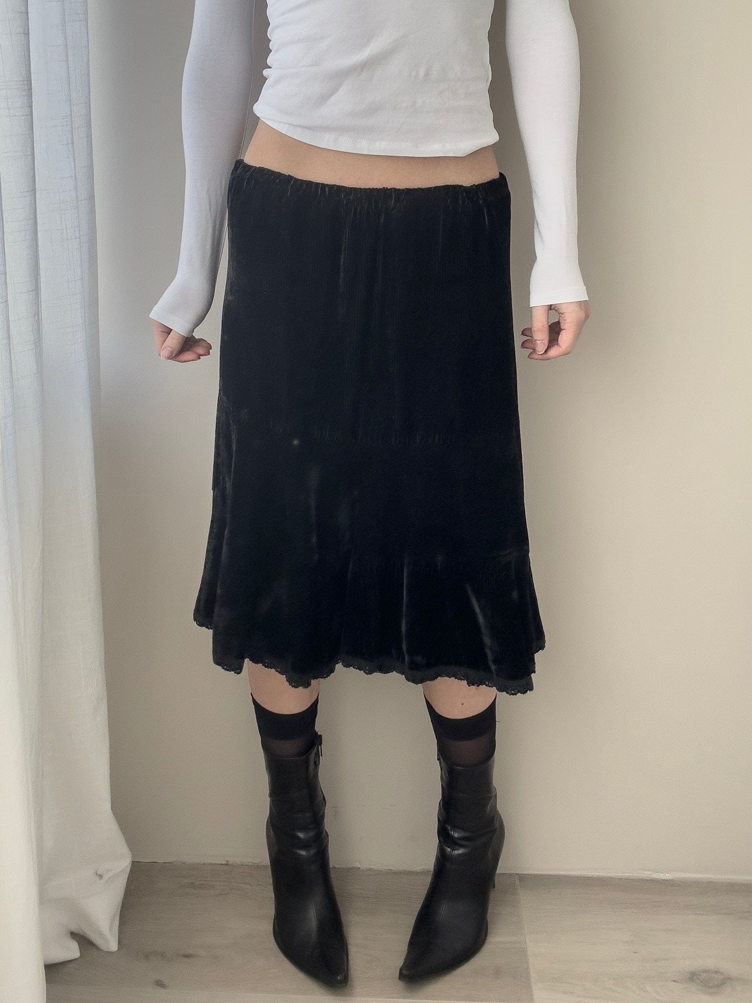Sportmax Silk Black Midi Skirt with Ruffled Lace Hem (XS-S)